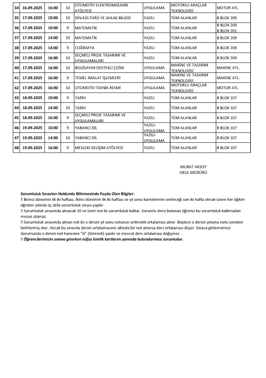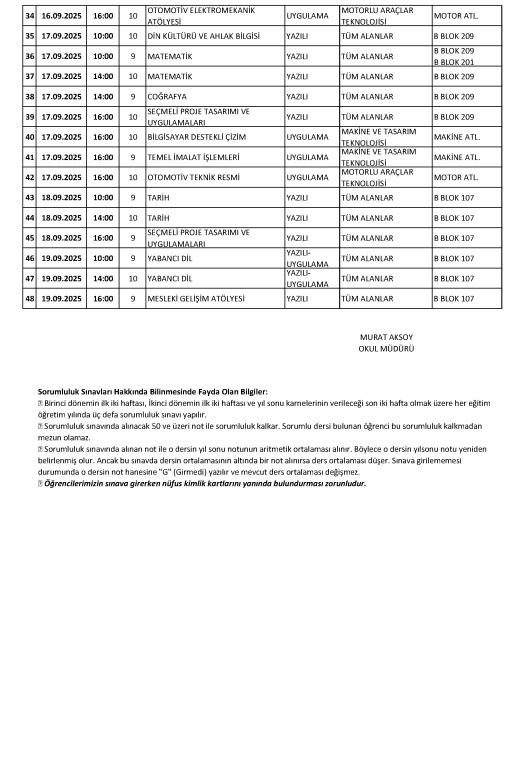 2025-2026 EĞİTİM ÖĞRETİM YILI EYLÜL DÖNEMİ SORUMLULUK SINAVLARI 09-19 EYLÜL 2025 TARİHLERİ ARASINDA YAPILACAKTIR.